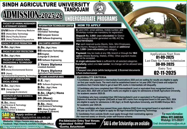 Sindh Agriculture University (SAU) Tandojam announces Undergraduate Admissions 2025–26. Apply for BS, BSc, DVM, Diploma & IT programs. Open for students from Pakistan, India, Canada & USA. D...