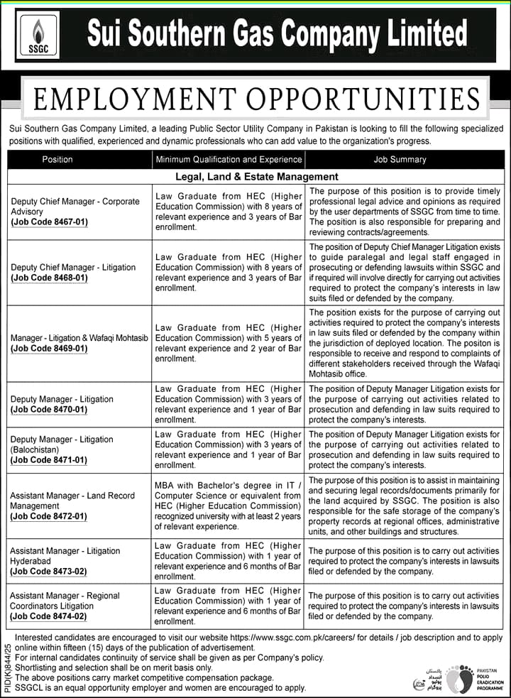 SSGC Jobs 2025 – Sui Southern Gas Company Limited is hiring Deputy Chief Managers, Managers & Assistant Managers in Legal, Land & Estate Management. Apply online now for government careers i...