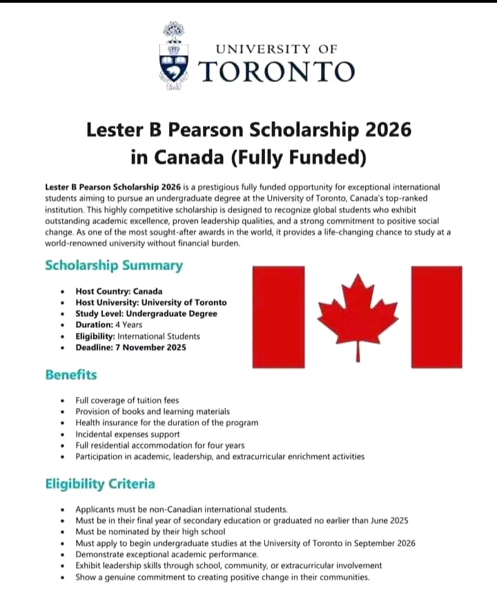 Apply now for the Lester B Pearson Scholarship 2026 in Canada (Fully Funded) at the University of Toronto. Open for international students from USA, Canada, India & Pakistan. Covers tuition, accommodation & more. Deadline: 7 November 2025