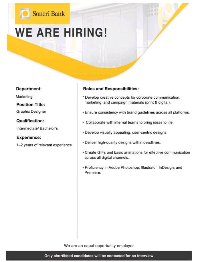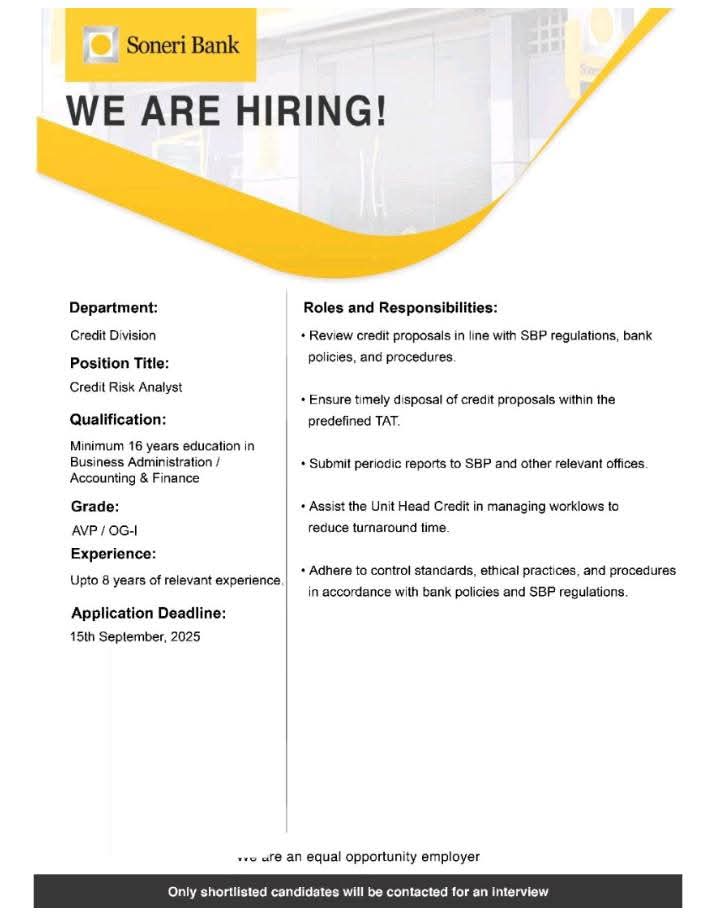 Soneri Bank is hiring in 2025! Exciting career opportunities in Pakistan for Credit Risk Analyst, Graphic Designer, and CASU Officer. Apply now before deadlines.